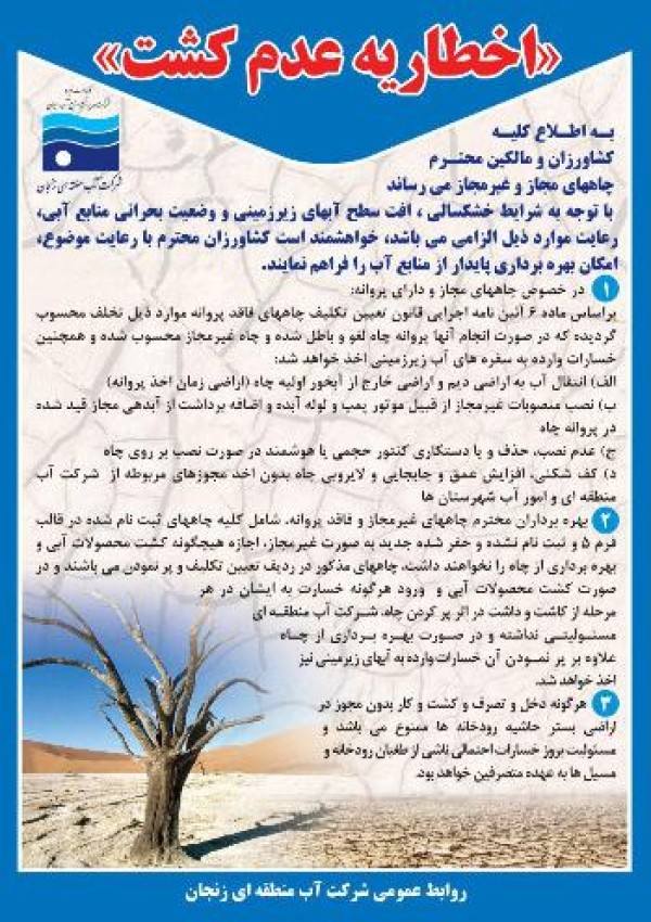 خدایی افزود: در مورد اضافه برداشت از مفاد پروانه صادره و انتقال آب به اراضی غیر آبخور اولیه شرکت آب منطقه ای زنجان هیچ گونه مماشاتی نداشته و از مالکان محترم خواست، هشدارهای مریوطه را جدی بگیرند.